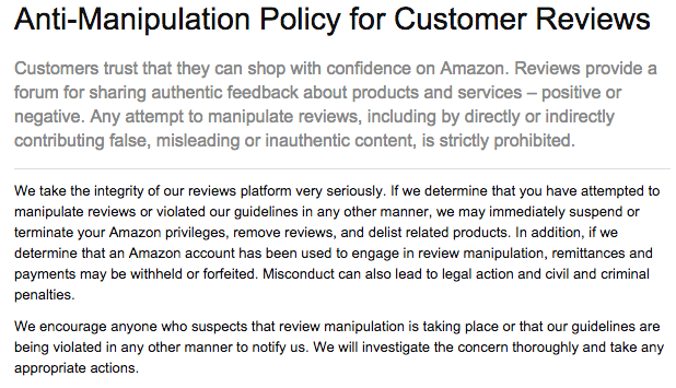 "Amazon strictly prohibits any attempt to manipulate customer reviews and actively polices its website to remove false, misleading, and inauthentic reviews."